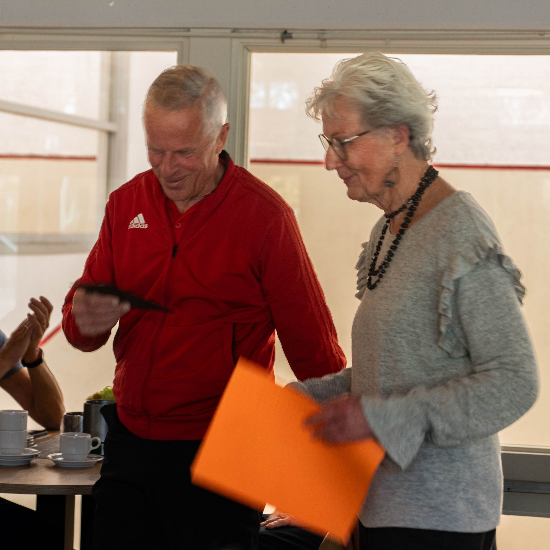 Hierna kreeg ik via Ell Stuifbergen een fraaie doos overhandigd met diverse presentjes waarin o.a. 2 lunchbonnen. Afkomstig van alle tennissers.